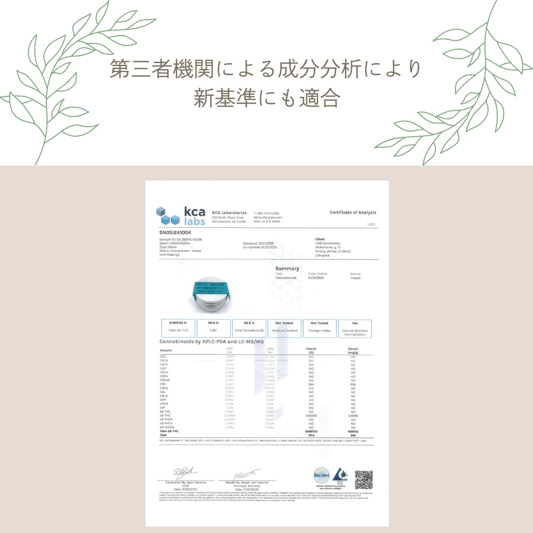 厳選されたオーガニックCBGを使用しており、原料のCBGアイソレートは第三者機関により安全性が確認されています。
